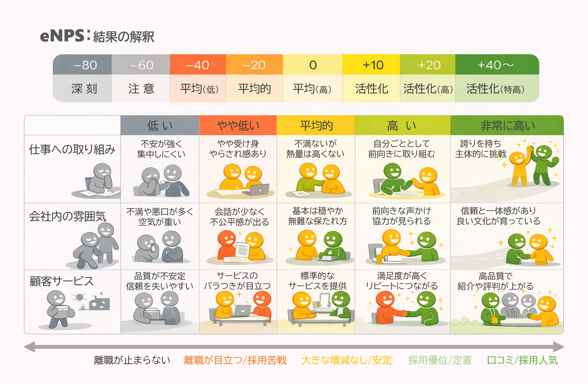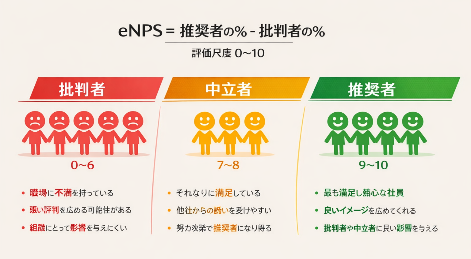 eNPSは、「この職場を親しい人に勧めたいと思えるか」を見る指標です。